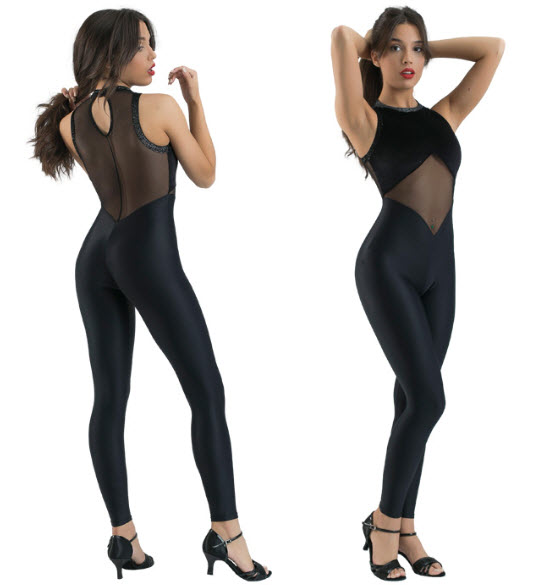 Mono entero para Baile Latino con tirante al cuello cierre clec, rombo centro delantero y espalda transparencia, tiras en sisa