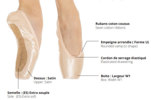 Zapatilla de punta para preparación, parte superior en satén, base ancha para un buen apoyo, suela 3/4 extra flexible, caja ancho W1 en U, cordón elástico para ajustar, cintas de algodón incluidas (cosidas) y bolsa de satén para guardarlas