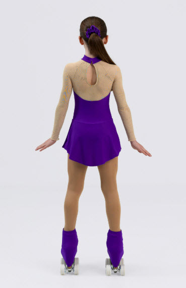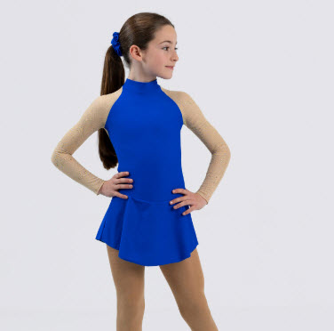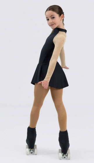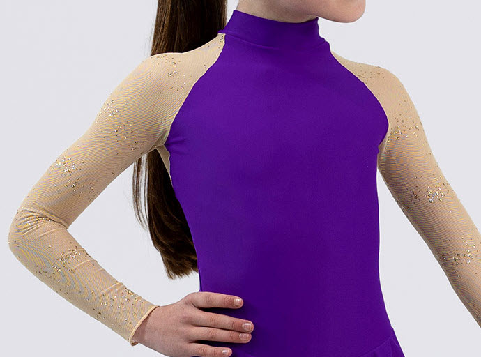 Maillot para patinaje artístico con falda, manga larga y cuello alto, cierre de corchete y lágrima, mangas y espalda en tul transparente con brillos, forro delantero