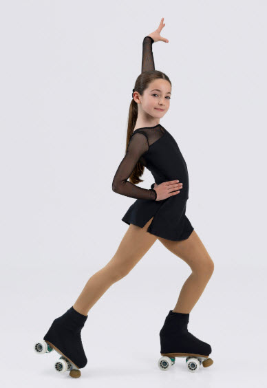 Maillot para patinaje artístico con falda y manga larga, tejido lycra mate combinado en tul con brillos en escote, espalda y mangas, forro delantero