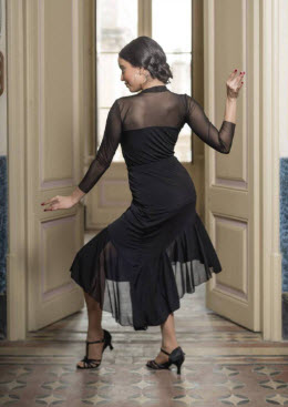 Camiseta Top para Baile de Salón o Baile Latino de manga larga, cuello alto, tul elástico en mangas, pecho y espalda