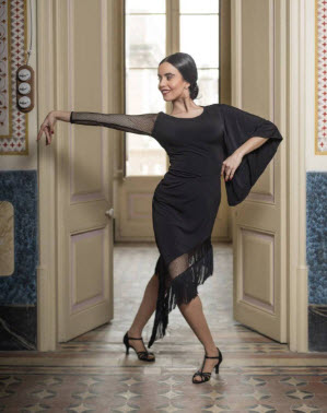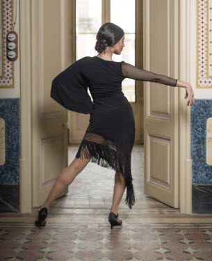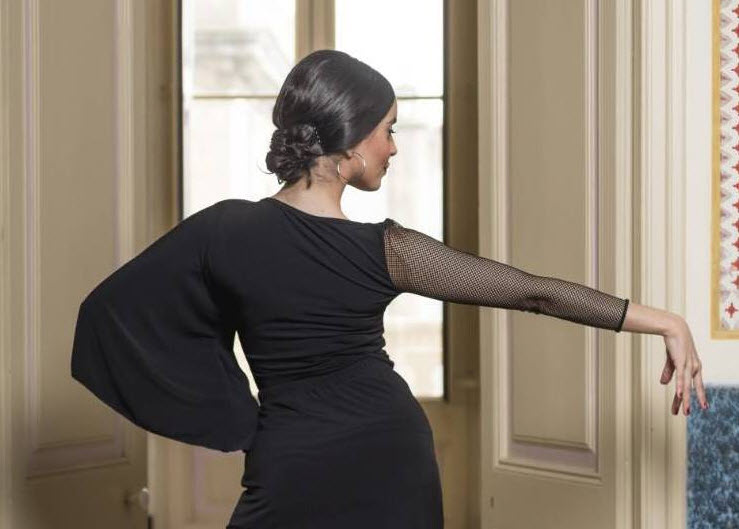 Camiseta Top para Baile de Salón o Baile Latino con una manga murciélago y otra en rejilla elástica, escote redondo y largo hasta cadera