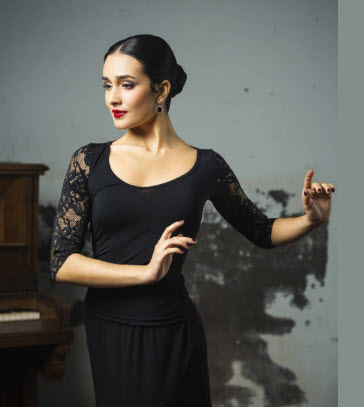 Camiseta Top para Baile de Salón o Baile Latino entallado de manga tres cuartos montada de blonda, escote redondo y largo hasta media cadera