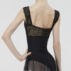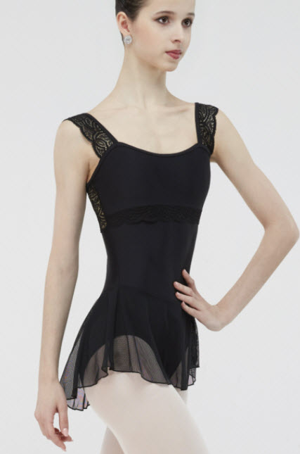 Un vestido sin mangas con una elegante capa superpuesta de encaje festoneado y una falda de tul elástica en cuatro direcciones
