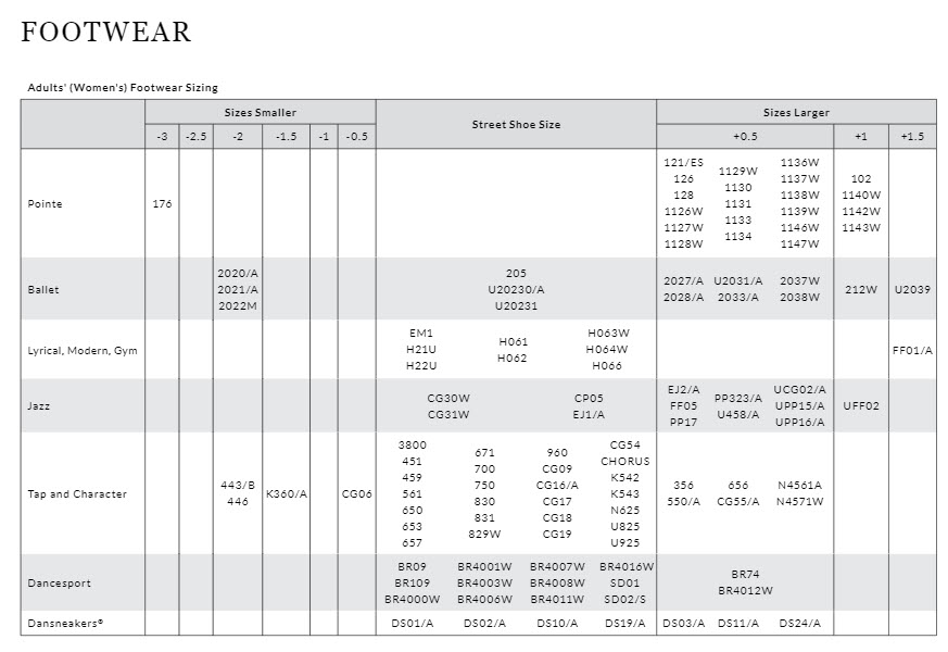 A continuación os mostramos las tablas de tallas de la marca Capezio en maillots, puntas de ballet, medias, calcetines, zapatos de baile moderno, o ropa de gimnasia rítmica y patinaje.