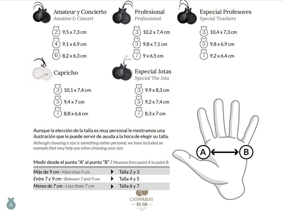 A continuación os mostramos las tablas de tallas de la marca Castañuelas del Sur tanto castañuelas de concierto o de doble caja, con medidas y equivalencias.
