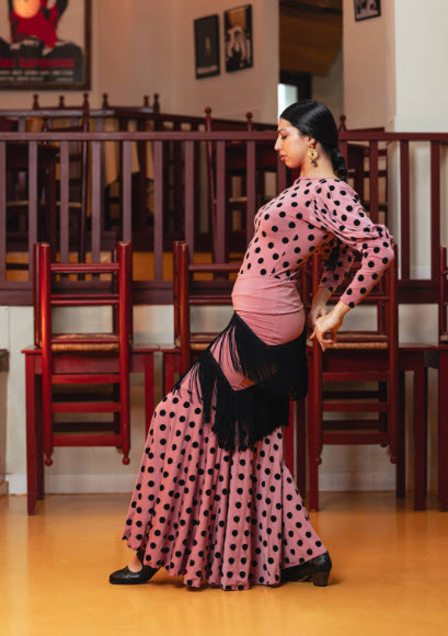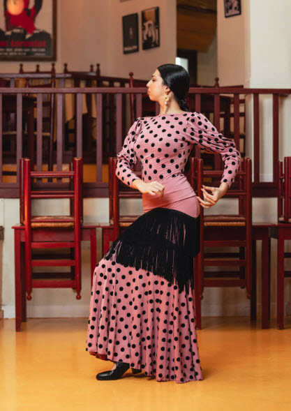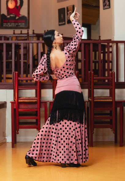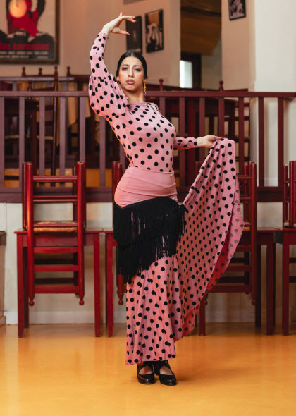 Elegida por nuestro equipo por su capacidad de potenciar el movimiento natural del flamenco. La combinación de flecos y volante de lunares crea capas de dinamismo que realzan la interpretación sin comprometer el ajuste ni la comodidad.