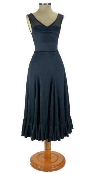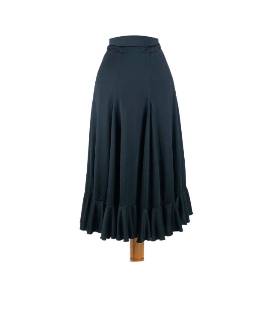 Esta falda está confeccionada en punto de licra, un tejido técnico ampliamente utilizado en faldas de flamenco por su excelente elasticidad y capacidad de recuperación. Se ajusta al cuerpo de forma firme pero cómoda, permitiendo marcar correctamente la línea de cadera y facilitando la supervisión técnica en clase. Su diseño incorpora un vuelo progresivo que responde con precisión en giros y desplazamientos, aportando volumen sin interferir en el trabajo de pies ni en la coordinación.