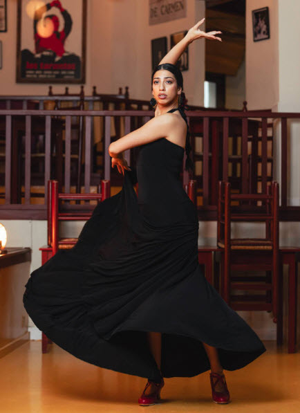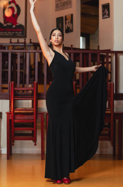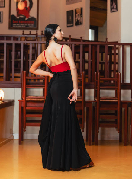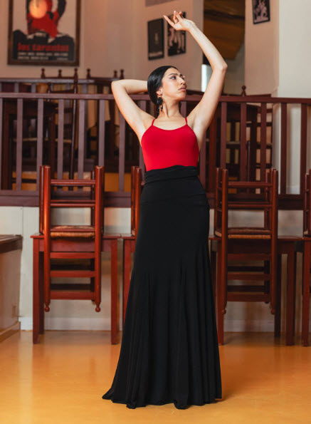 Este diseño versátil en punto elástico negro combina la funcionalidad de una falda con la presencia escénica de un vestido. Dentro de nuestra categoría faldas de flamenco y vestidos de flamenco, es una prenda especialmente práctica para academias y compañías que buscan polivalencia sin renunciar a la estética tradicional. Incorpora fajín que estiliza la cintura y asegura la sujeción durante el zapateado, delantero superior doble para mayor cobertura y ajuste, y anudado al cuello que permite llevarlo como vestido. También puede transformarse anudando la parte superior a la cintura, funcionando como falda larga independiente. La falda está confeccionada con 6 godets que aportan amplitud progresiva y un vuelo equilibrado en giros y remates.