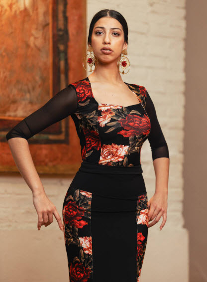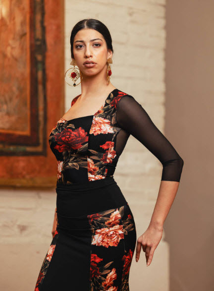 Este maillot entallado ha sido diseñado para resaltar la silueta y aportar una estética elegante dentro del vestuario de flamenco. El patronaje con costadillos de punto elástico estampado permite que la prenda se adapte al cuerpo de forma precisa, marcando la línea del torso y favoreciendo la colocación corporal durante el trabajo técnico. El fruncido en la parte delantera aporta un detalle estilizado que realza la zona del pecho y añade carácter visual sin interferir en la movilidad.