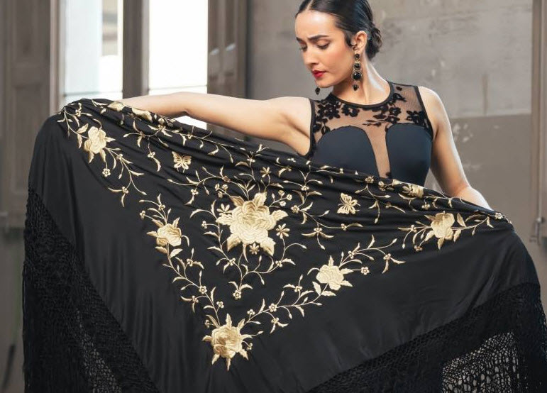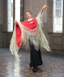 Mantón flamenco bicolor bordado con flores en mismo tono que flecos en crespón de seda única, flecos con enrejado